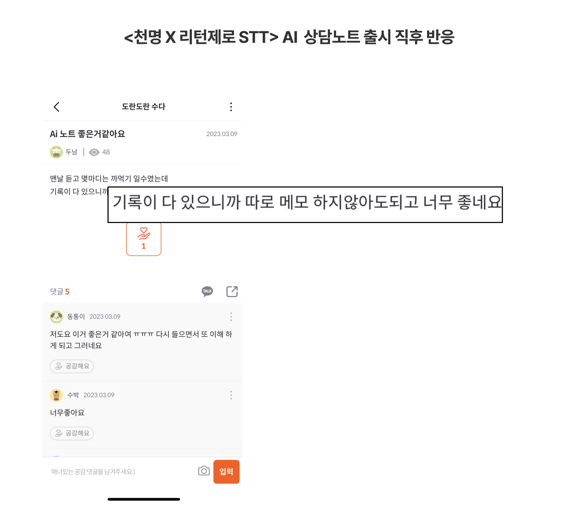 - 처음 기능을 런칭하며 베타 테스트를 하였는데 당시 데이터와 리뷰에서 천명 고객분들의 폭발적인 반응을 확인할 수 있었습니다. AI 상담노트를 이용한 고객과 그렇지 않은 고객의 리텐션 차이는 3배나 났습니다. 내부 게시판에서도 정성적인 피드백을 여러개 관찰할 수 있었습니다.