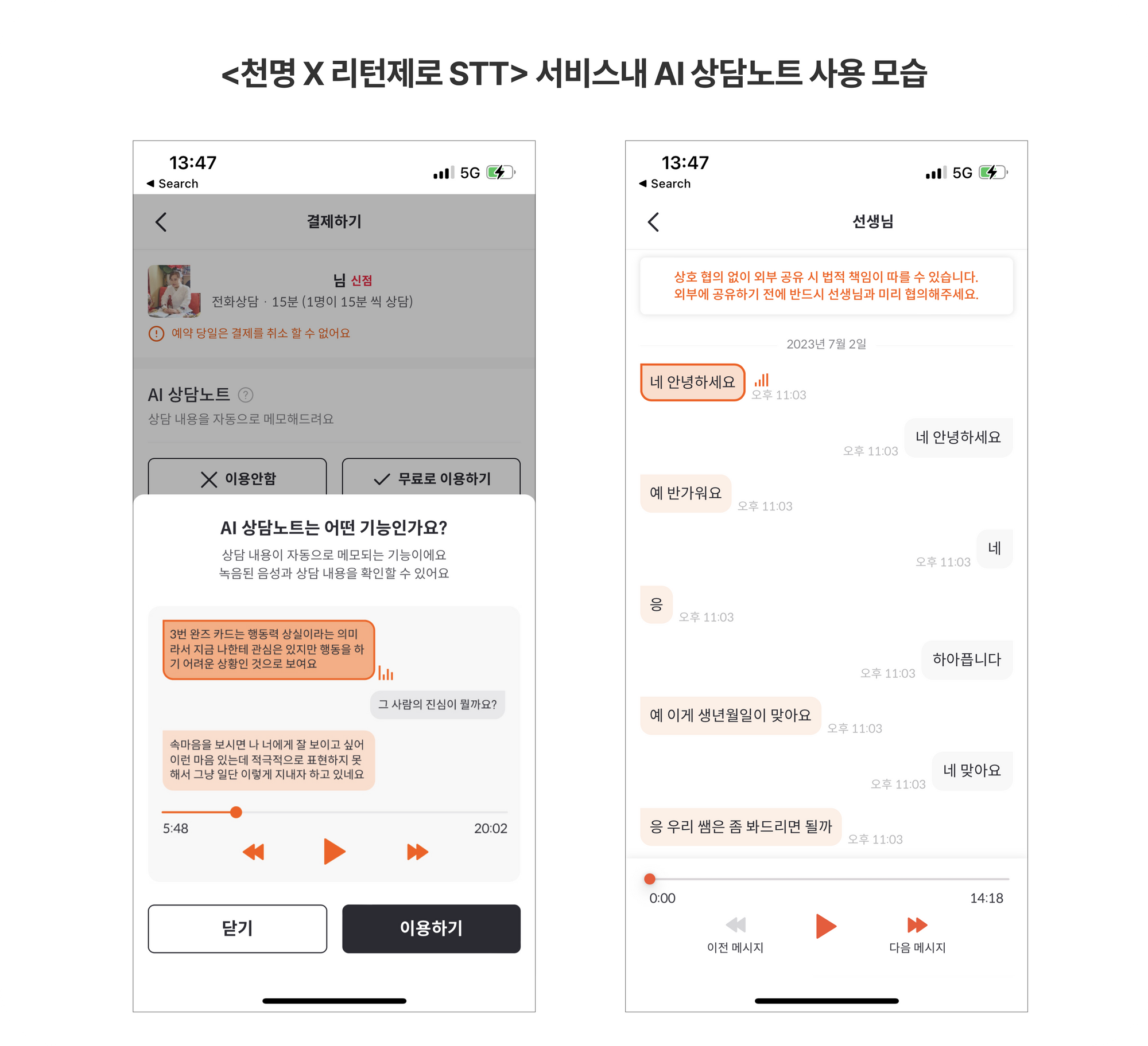 - 리턴제로와 천명은 수개월을 함께 일하며 문제를 풀어나갔습니다. 그 결과, 나의 상담이 자동으로 기록되고, 문자와 목소리를 동시에 확인할 수 있는 기능이 AI 상담노트라는 이름으로 런칭 되었습니다. 현재 천명의 주요한 차별점 중 하나로서 단단하게 자리매김 하고 있는 효자 기능입니다.