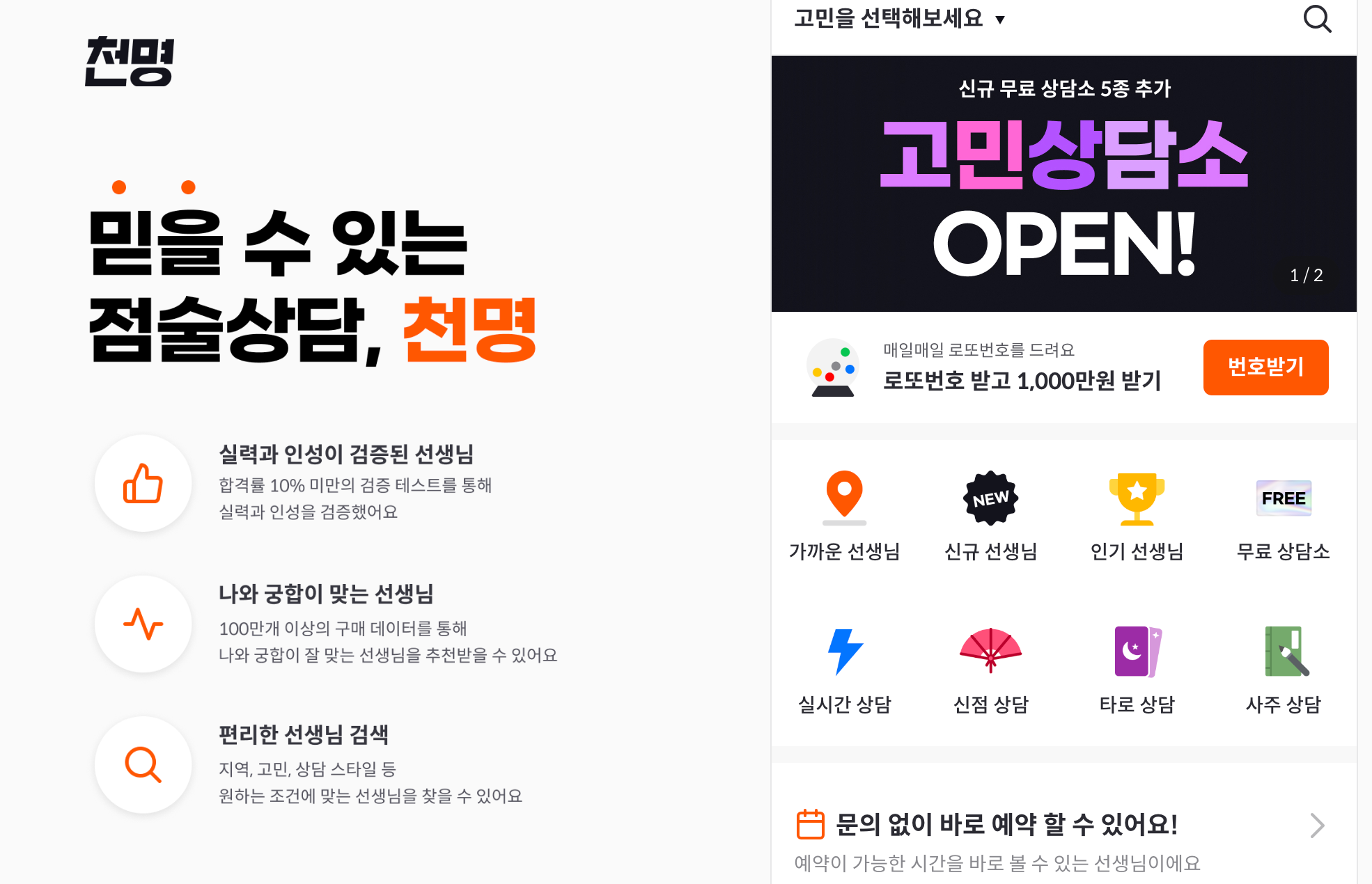 - 천명은 B2C 사주 및 타로 전문가 상담 어플입니다. 전화 통화를 통해 상담이 이루어집니다. 상담은 유료로 진행되며 가격은 30분당 2만원에서 10만원에 이릅니다.