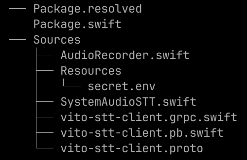 {프로젝트 폴더}/Sources/에서 다음 명령어를 실행하여 proto 파일을 컴파일하면vito-stt-client.pb.swift와vito-stt-client.grpc.swift2개의 파일이 생성됩니다.
