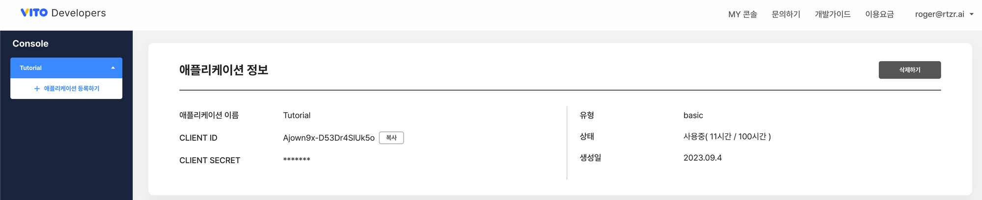 VITO API를 사용하기 위해선 VITO Developers에 회원가입 후 콘솔에서 애플리케이션을 등록해야 합니다. 아래와 같이 등록 후 CLIENT ID, CLIENT SECRET 값을 잘 저장해 두어야 합니다.
