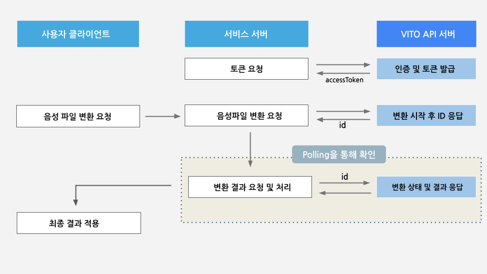 클라이언트는 서비스 서버에 음성파일 전사를 요청하고 서비스 서버에서 VITO 서버로 API 호출 및 응답 처리 후 클라이언트로 다시 반환하는 구조로 설계하려고 합니다.