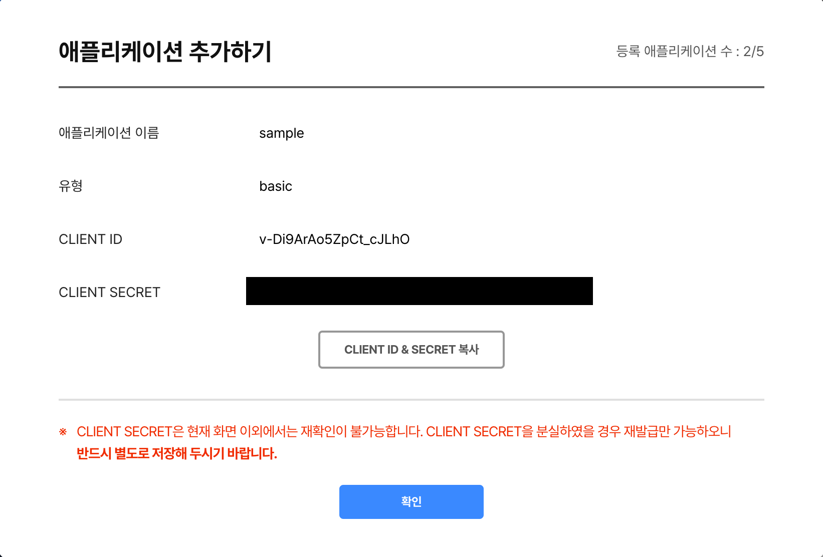 이후 아래처럼 CLIENT ID와 CLIENT SECRET 발급될텐데, 분실 시 재발급이 어려우니 별도로 저장해주세요!