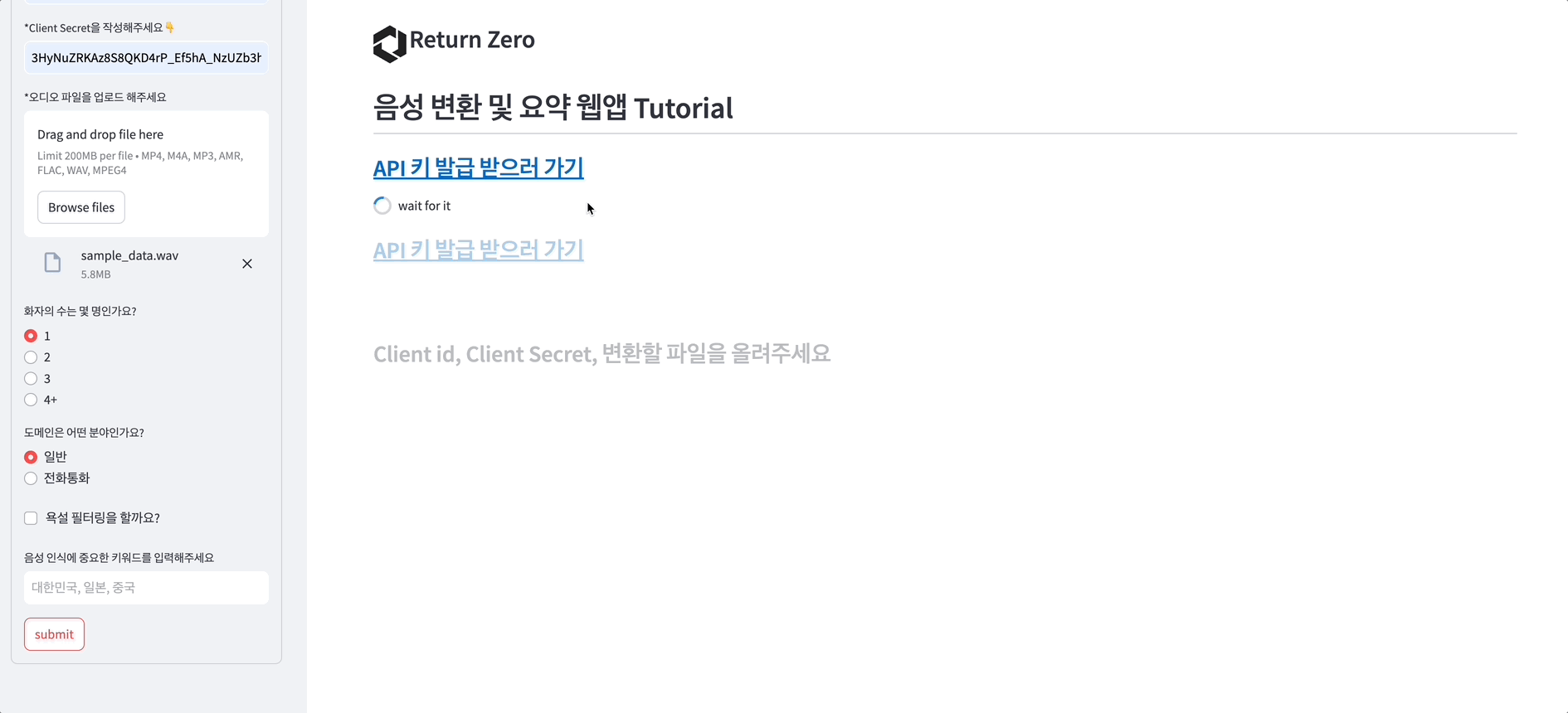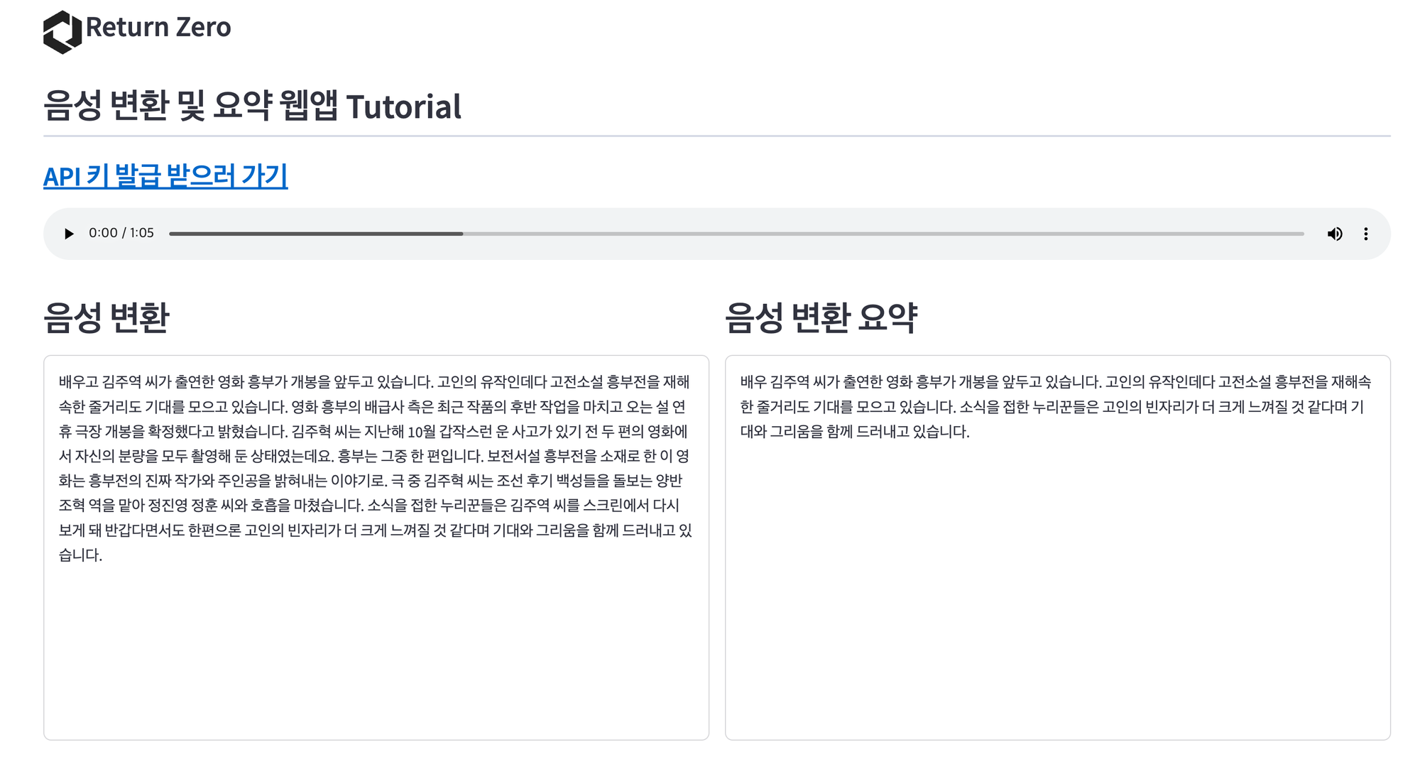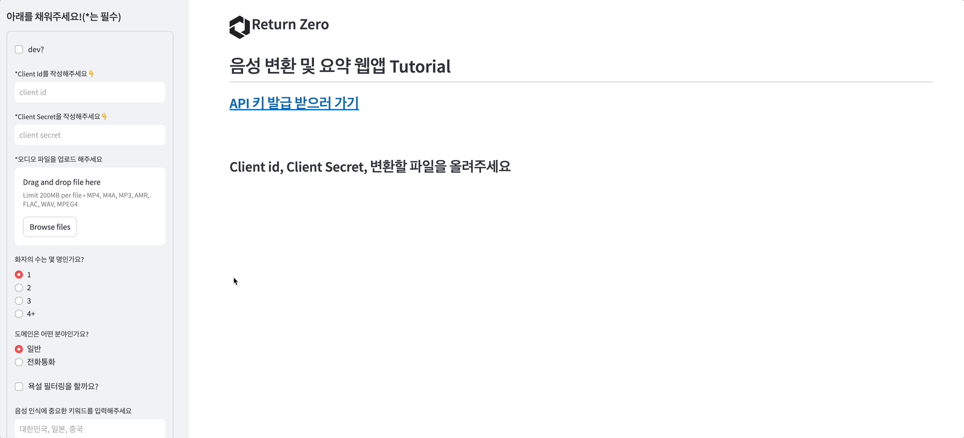 리턴제로는 Developers 사이트에서 우수한 음성인식(STT) API를 사용하는 방법을 제공하며, 이를 사용하는 방법은 아주 간단합니다. 이번 튜토리얼에서는 리턴제로의 API를 사용하여 Python만으로 음성변환 및 요약 웹앱을 만들어보겠습니다.